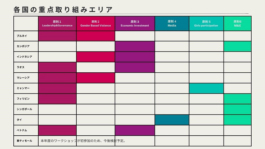2)ASEAN加盟国間で進捗状況を可視化するために、共通のジェンダー別の指標を定義すること