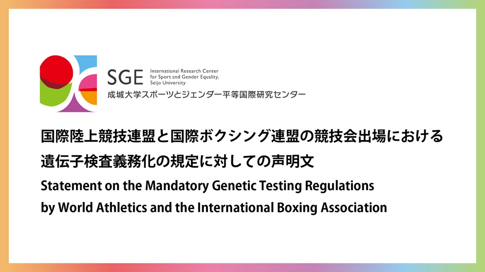 International Research Center for Sport and Gender Equality (SGE), at Seijo University strongly protests the new regulations introduced by the World Athletics (effective September 1) and the World Boxing Association (effective August 20). These regulations require athletes wishing to participate in international competitions to undergo an SRY genetics test, and, based on the results, classify them as biologically male or female to determine their eligibility to compete.