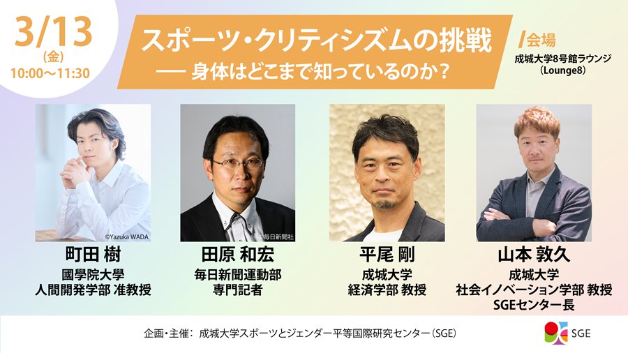 成城大学研究機構スポーツとジェンダー平等国際研究センター(SGE)は、スポーツをめぐる現代的課題について多角的に議論する公開収録シンポジウムを2026年3月に開催します。本シンポジウムでは、研究者や新聞記者などスポーツを専門的に分析する登壇者を招き、身体・科学・メディアといった観点からスポーツを批評的に読み解きます。収録された内容は、SGEのYouTubeチャンネルで公開予定です。