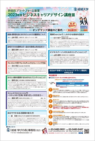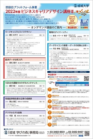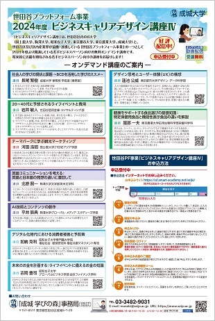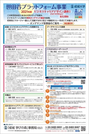 「ビジネスキャリアデザイン講座」とは、世田谷区内の6大学(国士舘大学、駒澤大学、昭和女子大学、東京都市大学、東京農業大学、成城大学)と、世田谷区、区内産業界が協働・連携している「世田谷プラットフォーム事業」の一つとして2021年度より開講している若手ビジネスパーソン向けの無料オンデマンド講座です。社会人や学生を対象としたリカレント教育や学び直し、新たな知識やスキル習得の機会を提供・醸成することを目的としています。
