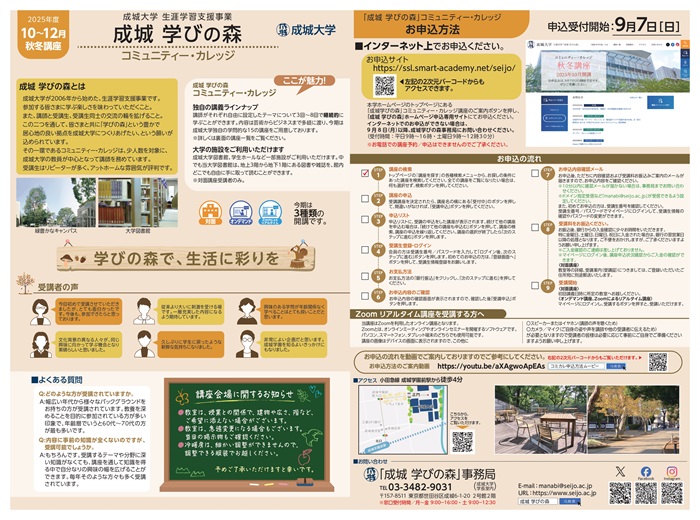 2025年度 成城学びの森 コミュニティー・カレッジ秋冬講座は、全15講座の開講を予定しております。 ・対面式13講座 ・オンデマンド式1講座 ・Zoomによるリアルタイム講座1講座 9月7日(日)~WEBお申込みスタートです。 お申込みはコチラです。