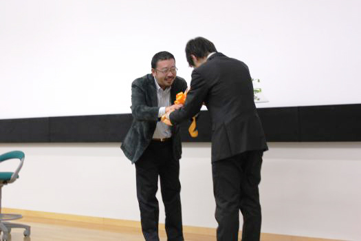 中村氏の後輩、映画研究部の学生から花束贈呈