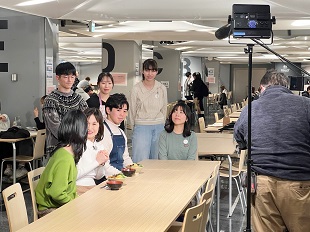 エシカル研究会が考案したプラントベースフード(学生食堂や売店で販売)について、実際にレポーターの方に試食いただき、販売に至るまでの経緯や概要の説明をしました。