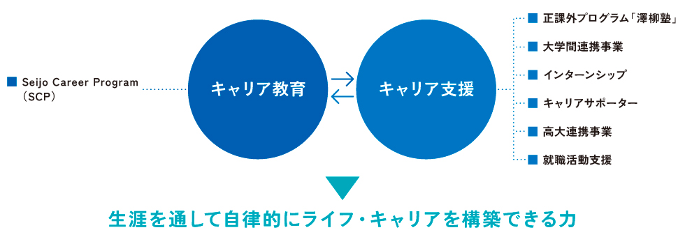 卒業後の就職にとどまらず、学生みなさんが生涯を通して自律的にライフ・キャリアを構築していくためのキャリア教育とキャリア支援を提供します。