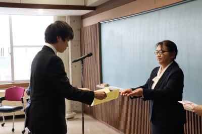 小林学生部長から表彰される学生活動奨励賞を受賞した学生たち