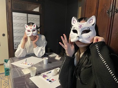 狐のお面の絵付け体験では、それぞれ好きな色を使って思い思いのお面を作りました。お面は持ち帰ることが出来るので、思い出を形に残すことが出来て留学生も嬉しそうでした。「絵付け体験が一番思い出に残った」と言っている人も多かったです。