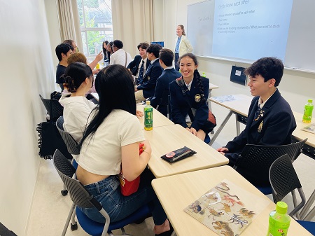 その後、英語による授業「Global Englishes」に参加し、成城大学の授業の雰囲気を体験しました。この日のテーマは「Why do people study English?(なぜ英語を学ぶのか)」。英語の世界的な広がりや多様な使われ方、教育方法などについて、成城大学生とマグダナ高校生が活発に意見を交わす姿が印象的でした。