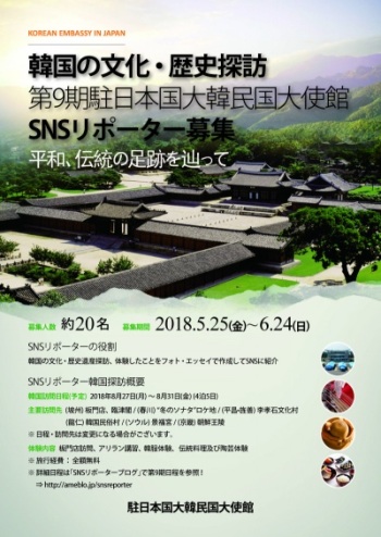 景福宮(ソウル)、朝鮮王陵(京畿)、板門店(坡州)など韓国の様々な場所を訪問します。また、アリラン講習や伝統料理体験など韓国の文化を学びます。期間は8月27日~31日の5日間です。体験したことをフォト・エッセイとしてSNSで紹介します。