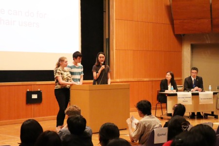 講演の後、今秋から留学へ向かう成城生41名と留学生がチームを組み「東京を障がいのある方にも利用しやすい街にするには」をテーマに3分ほどのプレゼンテーションを実施。8つの異なる視点から、東京が障がいを持つ人にとってすごしやすい街になるための施策が発表されました。この日に向け調査と準備を重ねた学生たち。大勢の前でも堂々としたスピーチでした。8チームによるプレゼンテーションのテーマは以下のとおりです。各チームの発表後にウヤンガさんと、アメリカ大使館職員の早川氏より講評をいただきました。