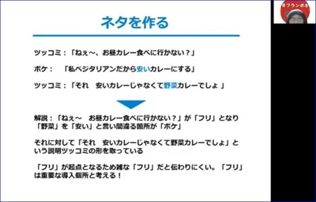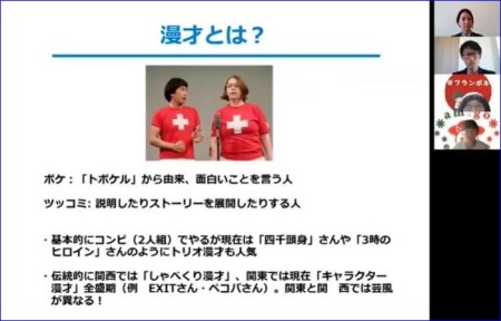 今回は吉本興業所属の芸人、日本で唯一フランス語で漫才ができる国際夫婦コンビ「フランポネ」(マヌー/シラちゃん)とスペイン語大好き芸人の藤田ゆみさんを講師に招き、参加者みんなで漫才を作成するワークショップをオンラインで行いました。
