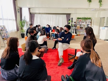 今回で最後となる「しゃべくり留学相談会」では、12月11日、9号館1階に新設されたグローバル・ラウンジにて、成城生20名と留学を経験した卒業生5名の社会人・大学院生が対面の懇親会を行いました。(感染症対策を徹底して実施しました)