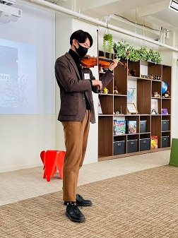 オープニングで情熱的なバイオリンの音で場を温めた阿部大河(文芸学部ヨーロッパ文化学科)さんは、2019年~2020年にドイツのエアランゲン大学に留学。ドイツでは地元のユース・オーケストラに所属をして、音楽を通して交流を深めました。コロナ禍でも諦めず留学に取り組もうとする後輩を励ますために「情熱大陸」を選んで心を込めて演奏しました。