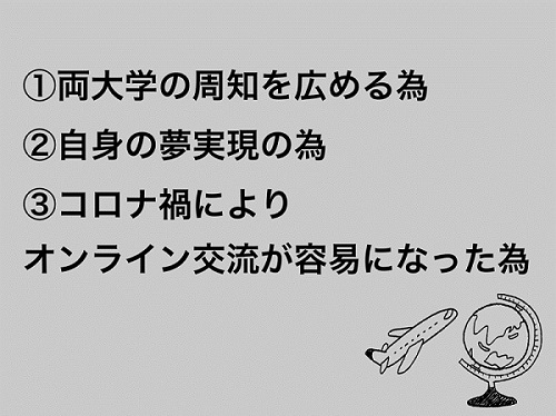 最後に、コロナ禍でオンラインによるイベントが容易に行えるようになったと考えたからです。オンラインを使ったイベントであれば、世界中どこの人とも繋がれると私は考えております。また、コロナ禍をチャンスと捉え、アメリカと日本、それぞれ時差もありながらも各国の文化交流ができればお互いの理解も深まり、留学や海外での生活、言語そのものに興味を持つ人が増えるのではないかと考えました。
