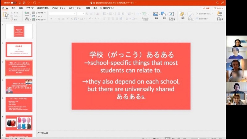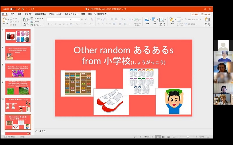 ブレイクアウトルームは数回に分けて20分程度行われ、“日本やオランダのあるある”やお互いの国の文化について話し、交流ができました。今回は事前準備として成城大学からの参加者には、何かしら自分の学校でのあるあるや学校の想い出の品を準備してもらうようお願いしました。中には日本の文化を紹介するスライドを用意した成城生もいました。前回よりも参加者の緊張が解け、さらに和やかな雰囲気の会となりました。