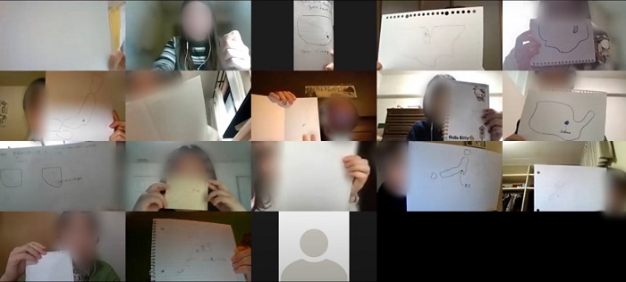 初めにメインルームで1人ずつ自己紹介としてお互いの名前・専攻・春休みの予定を共有しました。その後、日本からの参加者はアメリカ(アラスカ、ハワイを除く)の地図とインディアナ州の位置、アメリカからの参加者は日本の地図と東京の位置を紙に描くアイスブレークを行いました。どちらの参加者も正解に近い地図を描いており、お互いに感心していました。