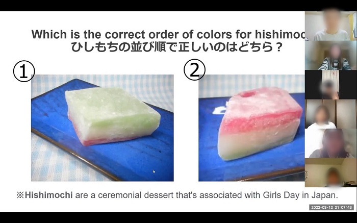 アイスブレークの続きとしてひな祭りに関するクイズを3問出題しました。日本の参加者も少し考えなければいけないクイズでしたが、ほとんどの参加者が見事正解しました。お互いに日本の文化への理解が更に深まったのではないでしょうか♪