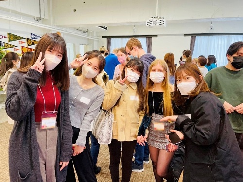 久しぶりの対面での国際交流の機会に、約30名の成城生や学部に在学する留学生がパーティーに集い交換留学生を歓迎しました。(感染症対策を行い実施し、記念撮影時のみマスクを外しました)
