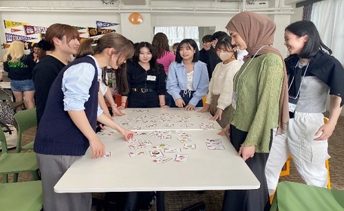 今回のコーヒーアワーでは、はじめにいくつかのグループに分かれ、それぞれのテーブルでカルタを行いました。想像以上に盛り上がり、留学生もたくさんの札をとれていました。