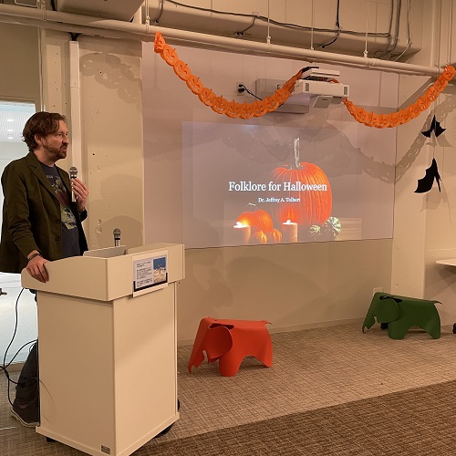 怪談研究をする外国人教員による「都市伝説講義」では、所々で悲鳴が上がるような怖い話を聴くことができました。英語での講義であったため、成城生が留学生に意味を聞くシーンが見受けられて、国際交流を感じられました。その他にも、仮装大会が最後にあり、とても盛り沢山な会にすることができました。