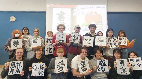 毎学期行われている交換留学生のための日本語の授業で、日本語ボランティアの成城生の協力の元、11月9日(木)に書道体験が行われました。 今回は色紙に好きな言葉を書きましたが、どの留学生も慣れた様子で書いていました。日本語ボランティアの成城生が留学生の座る各テーブルに1名ずつ入り、書道の書き方のこつについて丁寧にアドバイスしていました。日本での思い出の一コマになったのではないかと思います。