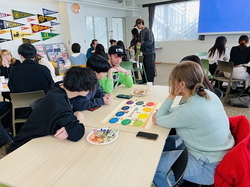 参加者からは「トークテーマが面白くて、留学生も在校生もすぐに打ち解けられて楽しかった!」という声をいただきました。ゲーム後の、グループをシャッフルしたフリートーク中もゲームボードを使って盛り上がっている様子が見られ、大盛況の中で終了しました。